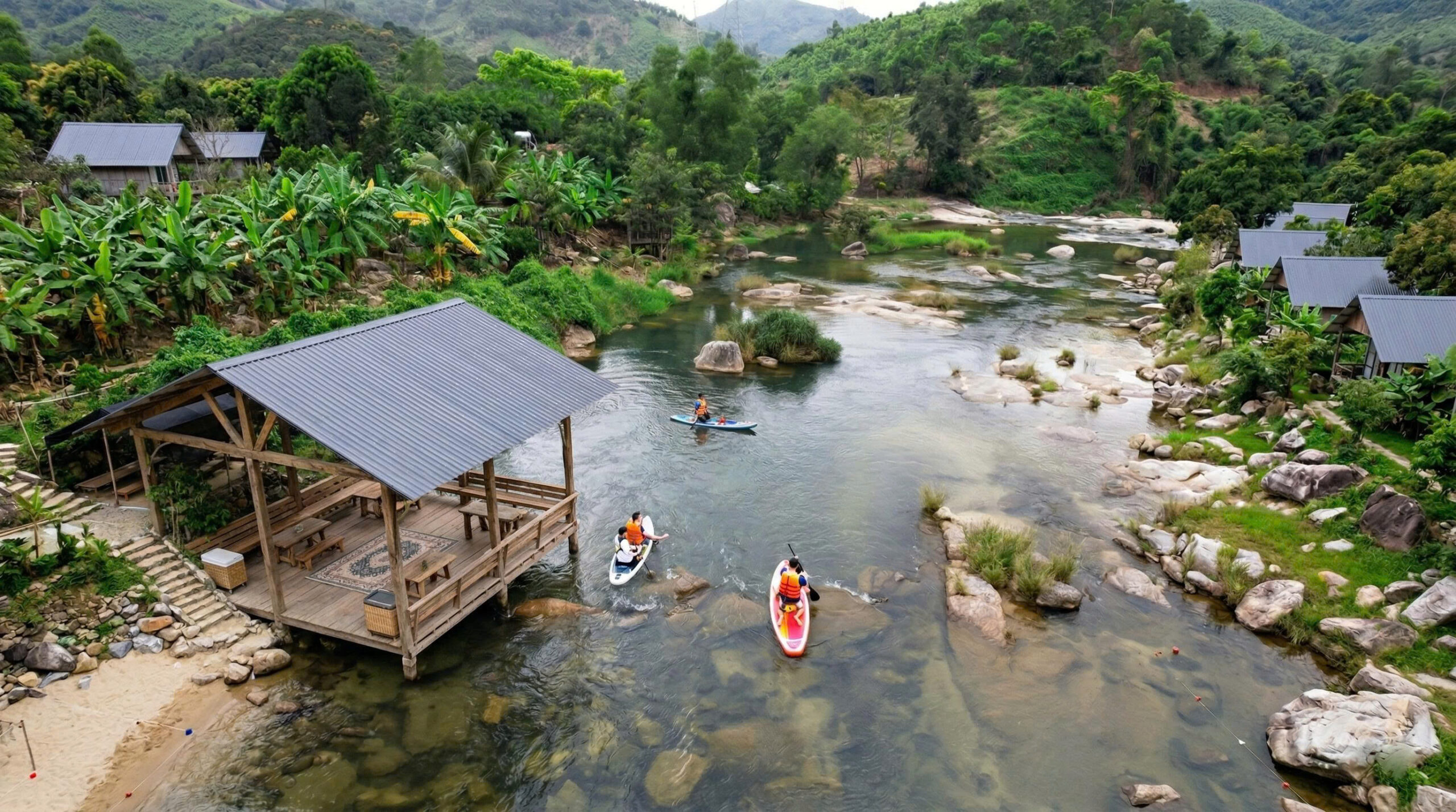 - Nhà sàn hơi thở Tây Bắc: Tái hiện nét văn hóa vùng cao đặc sắc, nâng tầm kiến trúc bản địa để phù hợp với địa hình dốc đá và khí hậu núi rừng Hòn Bà.